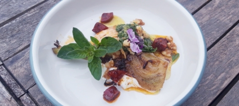 Crème de feta, sauce chimichurri aux orties, radis rôtis et caramélisés, volaille, noix et chorizo croustillant