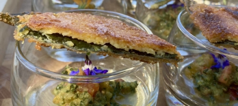 Une version croquante (vegan et sans gluten) des beignets de consoude classique, ici présentée comme support pour une salsa des tomates à la consoude, pour gouter la plante crue et cuite.