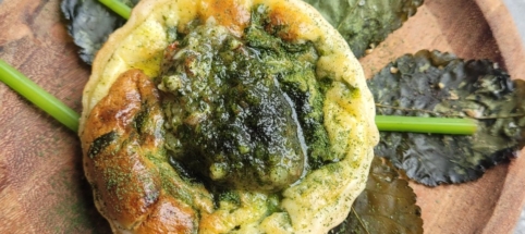 5. DECO 1. Poser une feuille "chips" sur l'assiette 2. Poser la quiche sur le chips 3. Saupoudrer à votre goût 4. Garnir avec les pétioles 5. Poser 1 càc de pesto sur le dessus de la quiche
